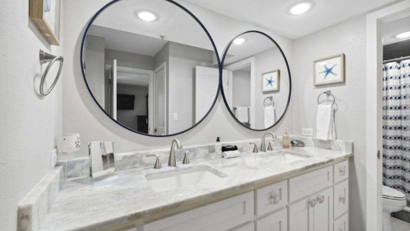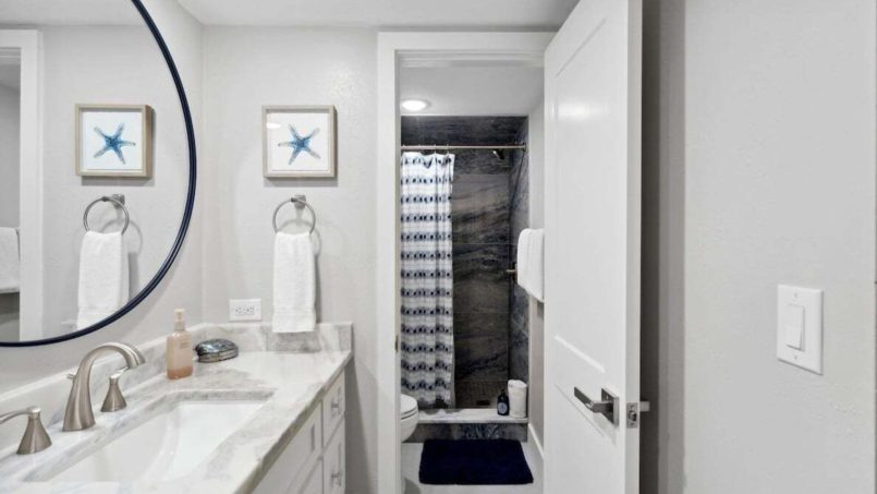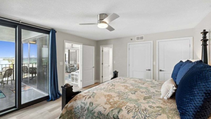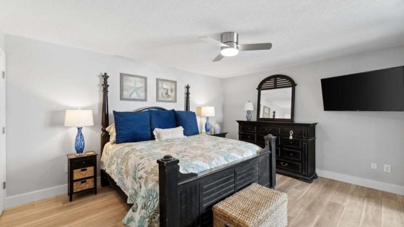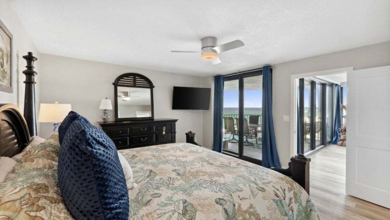 The master bedroom hosts a king bed with private bathroom that has a walk in shower and double vanity. There is a ceiling fan, smart TV, clothing storage, and direct balcony access with a great beach view.