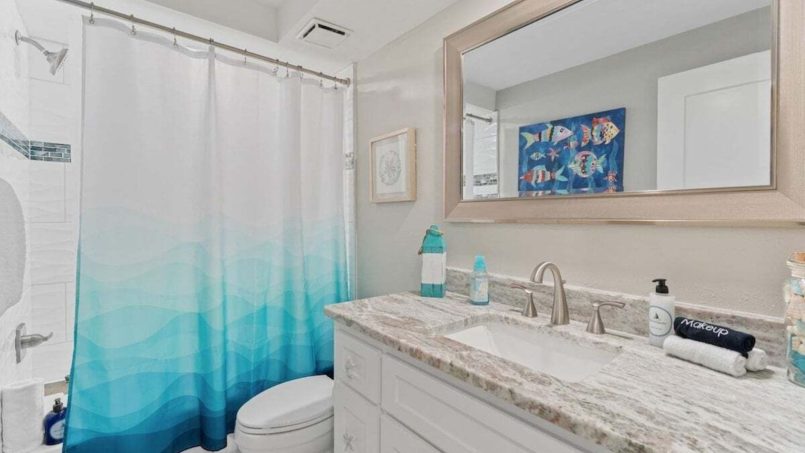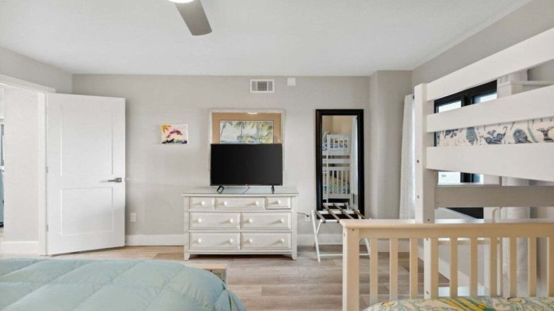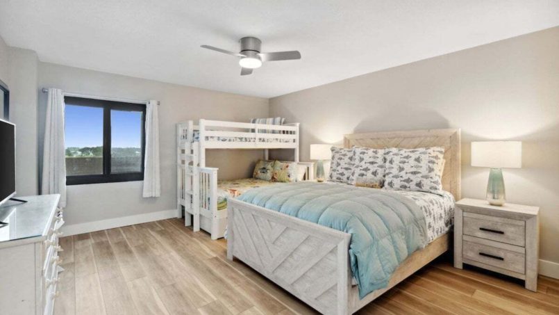 The second bedroom features a queen bed along with a full/twin bunk bed and is just steps away from the second bathroom with a tub/shower combo.